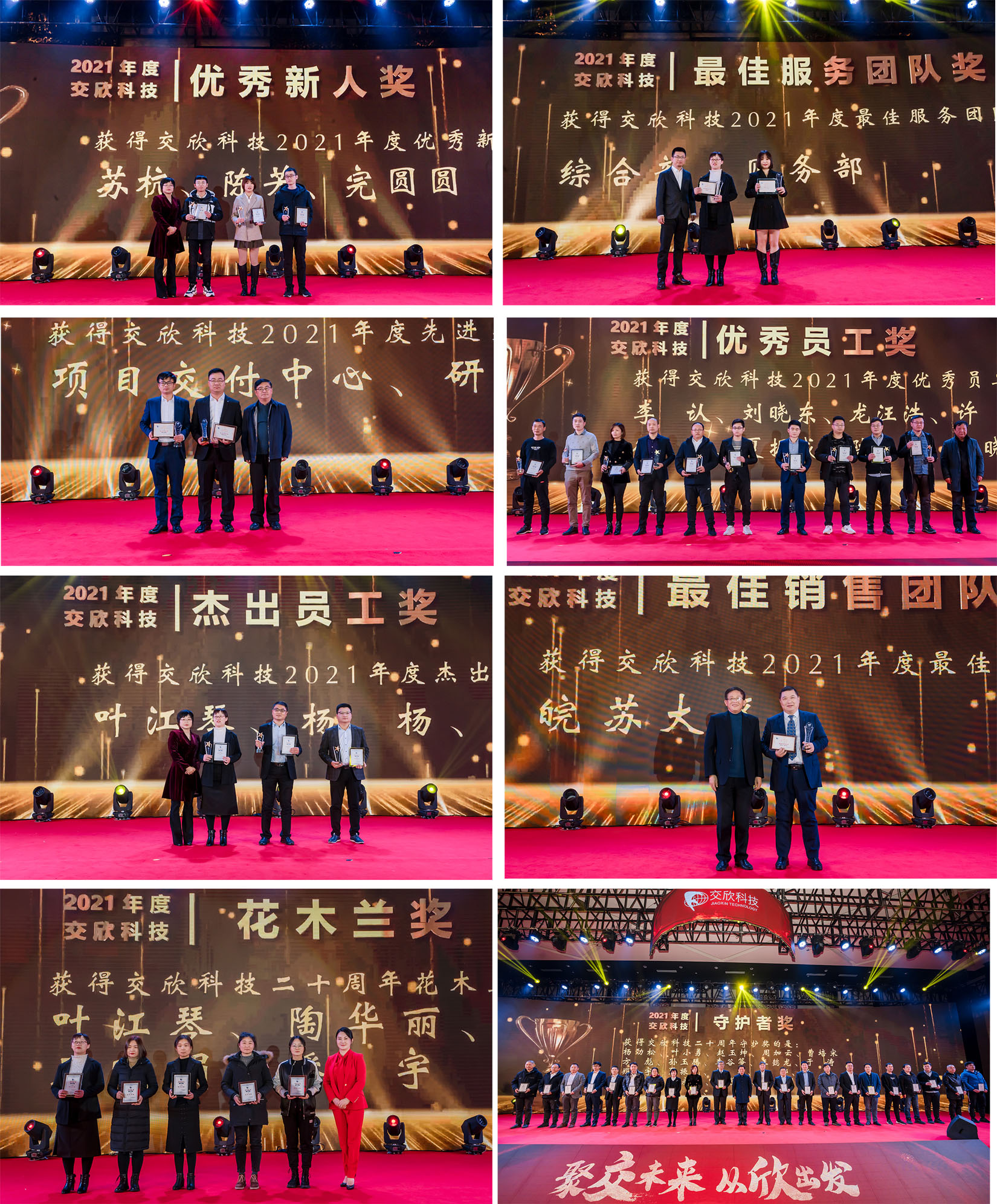 慶典活動上,交欣科技為2021年度先進個人、先進集體分別頒發(fā)了,優(yōu)秀員工獎、杰出員工獎、最佳銷售團隊獎、先進集體獎、花木蘭獎、守護者獎等獎項,以褒獎這些員工在公司發(fā)展過程中作出的突出貢獻。