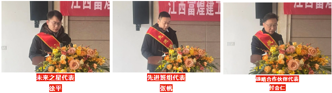 頒獎(jiǎng)結(jié)束后,未來(lái)之星代表工程管理中心施工員徐平、先進(jìn)班組代表東南事業(yè)部總監(jiān)張帆、戰(zhàn)略合作伙伴代表江西楚翔貿(mào)易有限公司董事長(zhǎng)付會(huì)仁作典型發(fā)言。