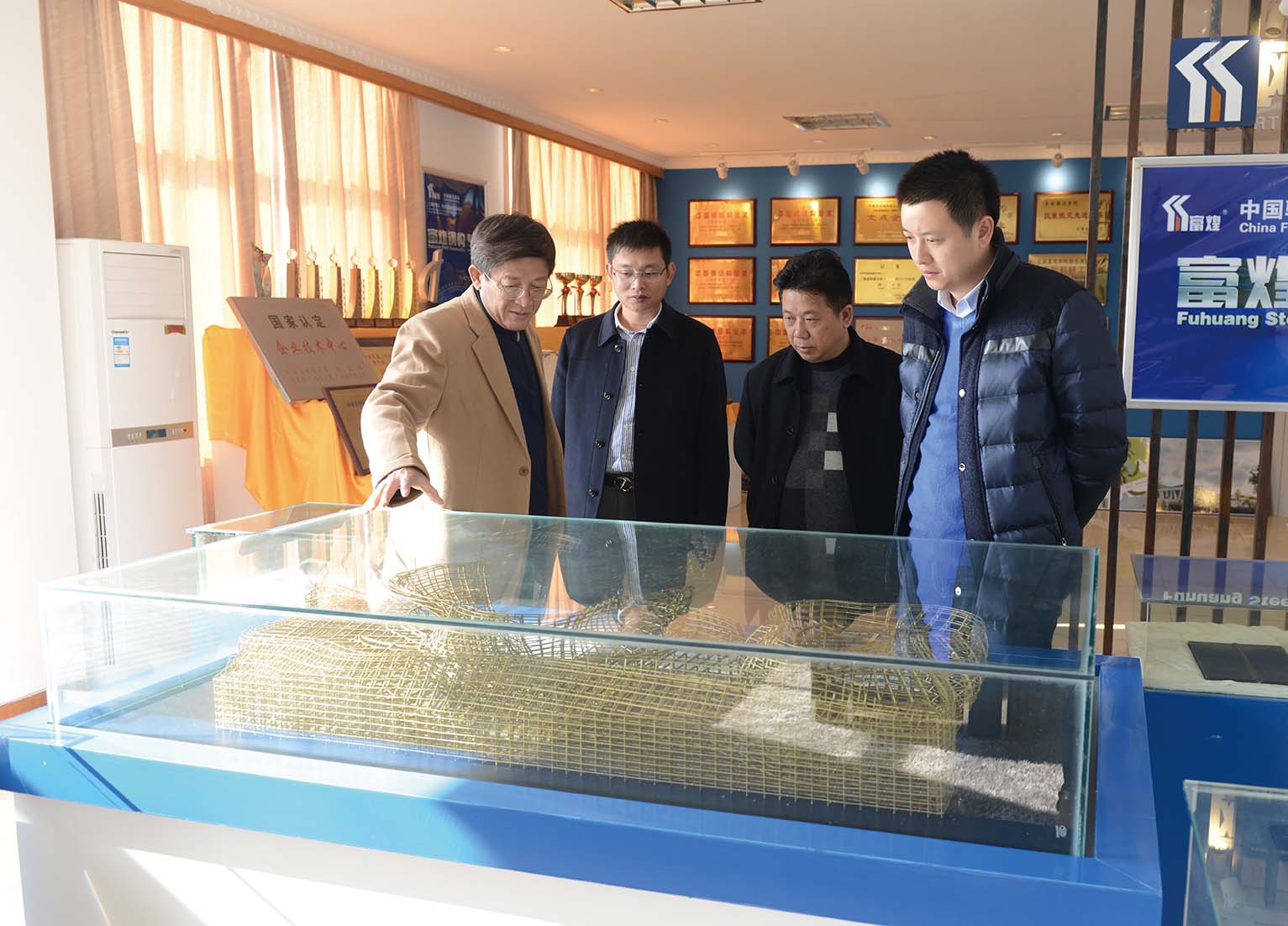 在戴陽(yáng)的陪同下,王松輝一行參觀考察了富煌重鋼4號(hào)車間、重鋼三期項(xiàng)目現(xiàn)場(chǎng)、富煌三珍公司、富煌門窗公司,并在群益樓前合影留念。隨后,在會(huì)議室,雙方進(jìn)行了親切友好的交流。